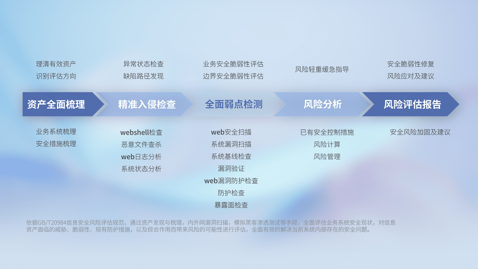 针对客户行业特性,,,,以专业的安全服务+多厂商联合解决方案提供专属的一站式安全管理服务,,,,帮助客户全面感知网络空间威胁,,基于识别、、、、检测、、、分析、、、、防护、、、监测、、、响应的服务理论模型,,,,从方案咨询、、、集成交付、、、、评估验证、、、、优化加固、、、、运维运营,,,致力于为客户提供完整的闭环管理式安全服务。。。以实战经验为客户打造高抵御风险的安全体系,,,帮助客户发现威胁、、对抗威胁、、、、处置威胁,,,,不断积累安全对抗能力,,,持续保障数字化安全。。。